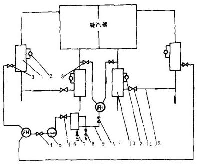 膠球清洗系統(tǒng)布置方式有兩種:一種是單元制,即凝汽器每側(cè)各配裝一套膠球清洗系統(tǒng)(見(jiàn)圖1),較適于為100MW及以上容量的機(jī)組配套;另一種是共用制,即兩臺(tái)收球網(wǎng)共用一臺(tái)膠球泵和裝球室,較適合于為小機(jī)組配套使用,如圖2所示。